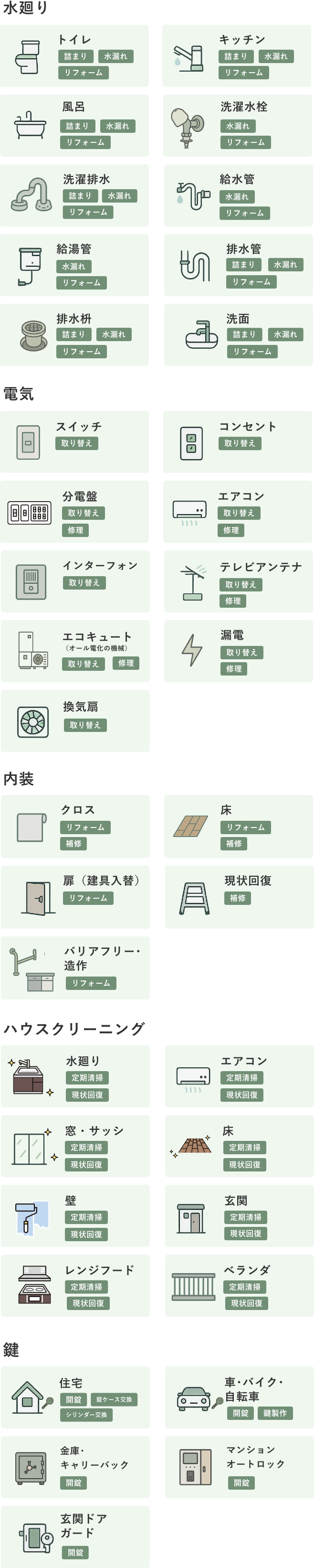 SIKKEN Groupは、電気修繕・工事の専門家として、お客様の暮らしを快適に保つためのサービスを提供しています。コンセント増設、エアコン設置・修理、アンテナ工事、分電盤交換、スイッチ交換、照明設置、防犯カメラ設置など、幅広い電気トラブルに迅速かつ丁寧に対応いたします。小さな豆電球の交換から大規模な工事まで、お客様の安全で快適な暮らしをサポートしますので、まずはお気軽にご相談ください。